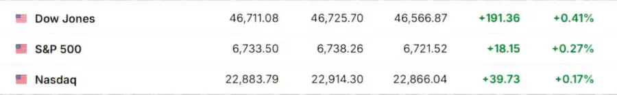 Американские рынки открылись с положительной динамикой, чему способствовали надежды на снижение ставок ФРС. Индексы Dow Jones (+0,41%), S&P 500 (+0,27%) и NASDAQ (+0,17%) показывают рост, несмотря на частичный шатдаун правительства.