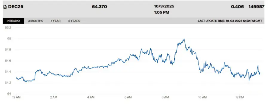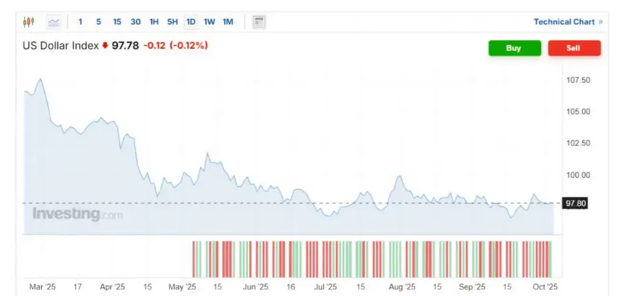 Индекс доллара США (U.S. Dollar Index, DXY), который отражает курс доллара по отношению к основным мировым валютам (евро, иена, фунт и другие), ослаб на 0,12%. Это снижение связано с увеличением ожиданий по поводу возможного снижения процентных ставок Федеральной резервной системой на фоне слабости рынка труда и неопределённости, вызванной частичным закрытием правительства США.