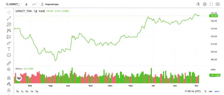 На Казахстанской фондовой бирже (KASE) по состоянию на 17:00 по времени Астаны средневзвешенный курс доллара составил 547,46 тенге, что на 0,47 тенге выше предыдущего значения. Официальный курс Национального банка на 3 октября составляет 546,96 тенге за доллар.