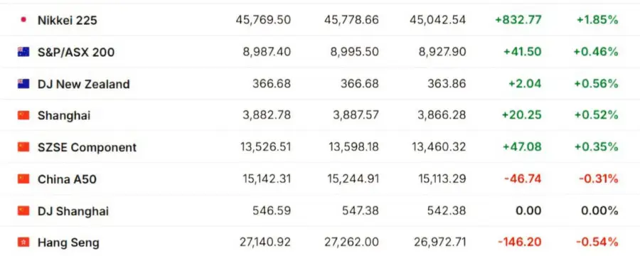 Азиатские фондовые рынки показали смешанную динамику. Индекс Shanghai Composite вырос на 0,52%, в то время как Hang Seng снизился на 0,54%. В Японии индекс Nikkei 225 увеличился на 1,85% благодаря росту акций Hitachi после объявления о партнерстве с OpenAI в сфере ИИ.
