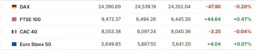 Европейские рынки также продемонстрировали разные тренды: индекс FTSE 100 (+0,47%) в Великобритании вырос благодаря акциям финансовых и горнодобывающих компаний, в то время как DAX (-0,20%) в Германии и CAC 40 (+0,04%) во Франции снизились на фоне политической неопределённости в США.
