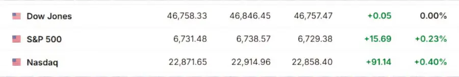 Американские рынки открылись в положительной зоне, несмотря на частичное закрытие правительства США. Индекс Dow Jones немного снизился на 0,05%, в то время как S&P 500 и NASDAQ выросли на 0,23% и 0,40% соответственно.
