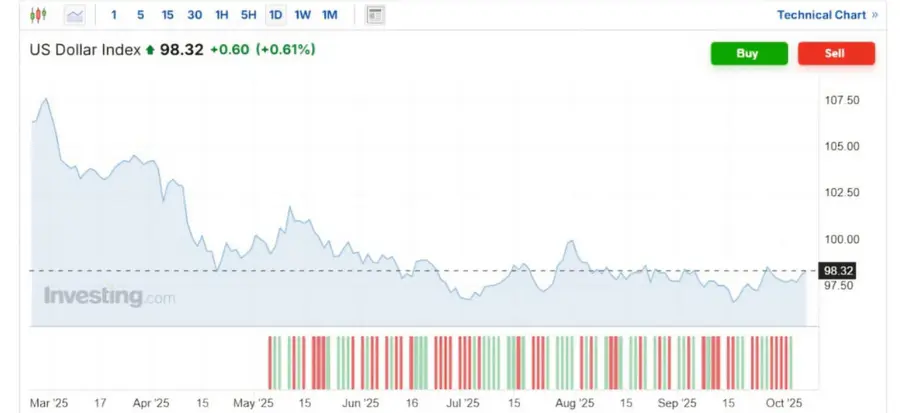 Индекс доллара США (DXY) вырос на 0,61%. Основные факторы этого роста включают ослабление японской иены после выборов нового премьер-министра Японии и повышение цен на нефть, что также поддерживает американскую валюту. Дополнительно, неопределенность в США из-за шатдауна правительства и ожидания снижения процентных ставок ФРС способствуют укреплению доллара.