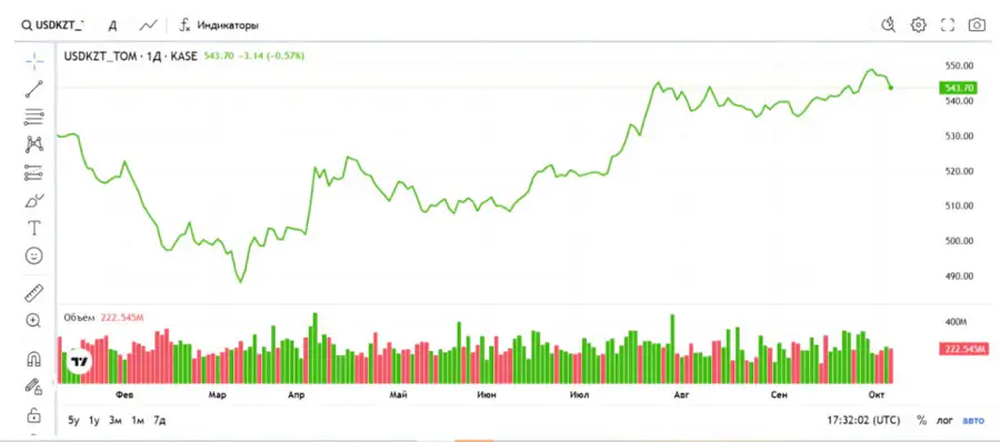 На Казахстанской фондовой бирже (KASE, в 17:00 по времени Астаны) средневзвешенный курс доллара составил 545,26 тенге, что на 2,2 тенге ниже предыдущего значения. Официальный курс Национального банка на 6 октября составляет 547,57 тенге за доллар.