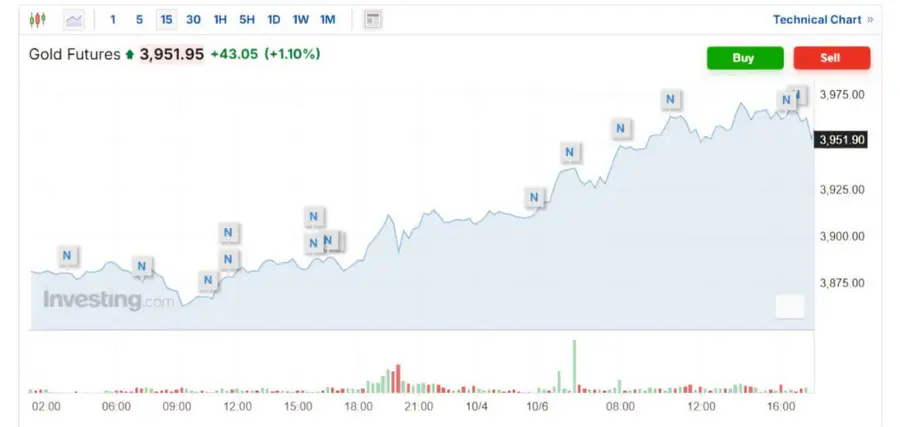Золото достигло рекордной отметки, превысив 3 950 долларов за унцию. Рост цен на золото связан с повышенным спросом на безопасные активы на фоне частичного закрытия правительства США и ожиданий снижения процентных ставок.