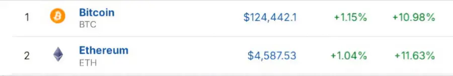 Курс Bitcoin (BTC) увеличился на 1,15%, а Ethereum (ETH) поднялся на 1,04%, достигнув 4 587,53 доллара. Этот рост связан с растущим интересом к криптовалютам как к безопасным активам и притоком средств в криптофонды.