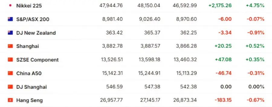 Азиатские рынки показали смешанные результаты. Индекс Shanghai Composite вырос на 0,52%, в то время как Hang Seng снизился на 0,67% из-за низкой торговой активности во время праздников в Китае. Японский индекс Nikkei 225 увеличился на 4,75% на фоне назначения нового лидера правящей партии.