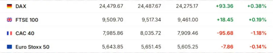 Европейские рынки также показали смешанную динамику. Индексы FTSE 100 (+0,38%) и DAX (+0,19%) поднялись, в то время как CAC 40 (-1,18%) снизился на фоне политической нестабильности во Франции.