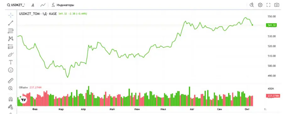 На Казахстанской фондовой бирже (KASE) по состоянию на 17:00 по времени Астаны средневзвешенный курс доллара составил 541,45 тенге, что на 3,81 тенге ниже предыдущего значения. Официальный курс Национального банка на 7 октября составляет 545,67 тенге за доллар.