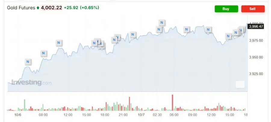 Стоимость золота достигла рекордного значения, превысив 4000 долларов за унцию. Этот рост был вызван продолжающейся политической и экономической неопределённостью в мире, включая шатдаун правительства США. Фьючерсы на золото повысились на 0,65% и составили 4002,22 доллара за унцию.