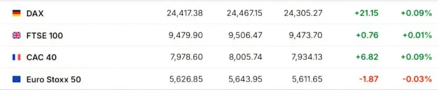 Европейские фондовые рынки в целом показали положительную динамику, с небольшими изменениями в основных индексах: FTSE 100 (+0,01%), CAC 40 (+0,09%) и DAX (+0,09%). Однако индекс Euro Stoxx 50 снизился на 0,03%.
