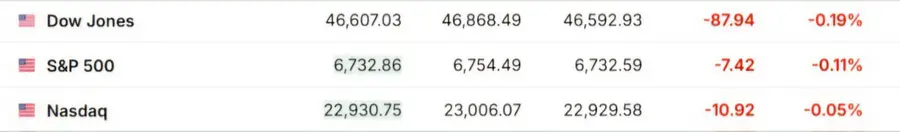 Американские рынки открылись с падением: индекс Dow Jones снизился на 0,19%, S&P 500 на 0,11%, а NASDAQ на 0,05%. Причины такого снижения связаны с неопределённостью в экономике и ожиданиями действий Федеральной резервной системы по процентным ставкам.