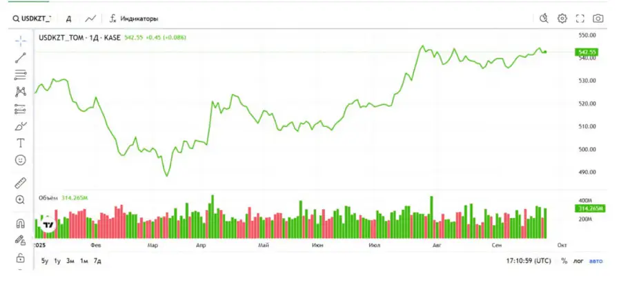 На Казахстанской фондовой бирже (KASE) курс доллара на 17:00 по времени Астаны составил 544,45 тенге, увеличившись на 2,64 тенге. Официальный курс Национального банка на 26 сентября составляет 541,68 тенге за доллар.