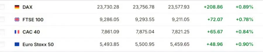 Европейские рынки показали положительную динамику, укрепившись на фоне ожидания снижения ставок ФРС. Основные индексы, такие как DAX (+0,89 процента), FTSE 100 (+0,78 процента), CAC 40 (+0,84 процента) и Euro Stoxx 50 (+0,90 процента), завершили день в плюсе.