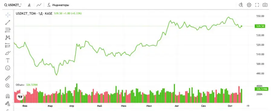 По данным Казахстанской фондовой биржи (KASE), на 17:00 по времени Астаны средневзвешенный курс доллара составил 538,93 тенге, увеличившись на 1,22 тенге. Официальный курс Национального банка на тот же день составляет 537,77 тенге за доллар.