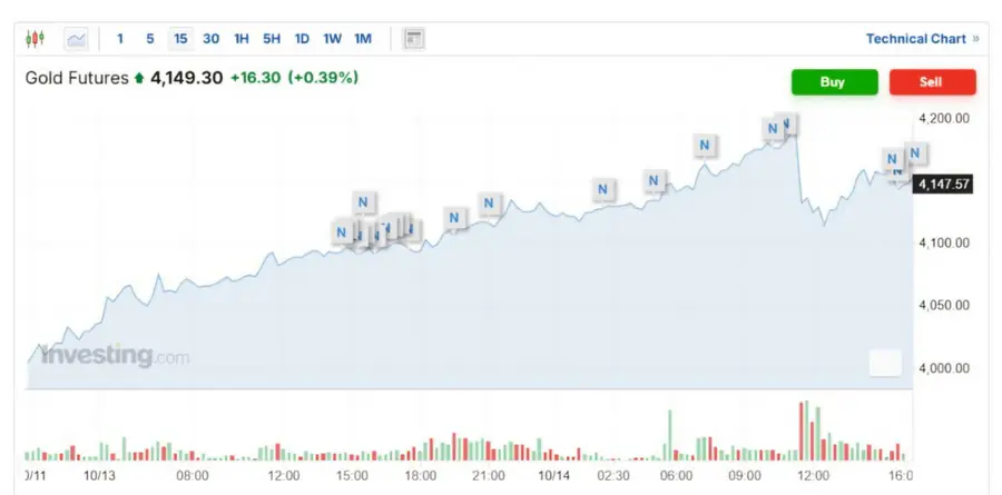 Золото продолжает дорожать, оставаясь на рекордных уровнях на фоне глобальной экономической неопределенности и геополитической напряженности. Фьючерс на золото вырос на 0,39%, составив 4 149,30 доллара за унцию.