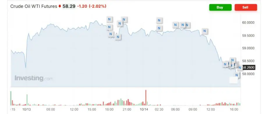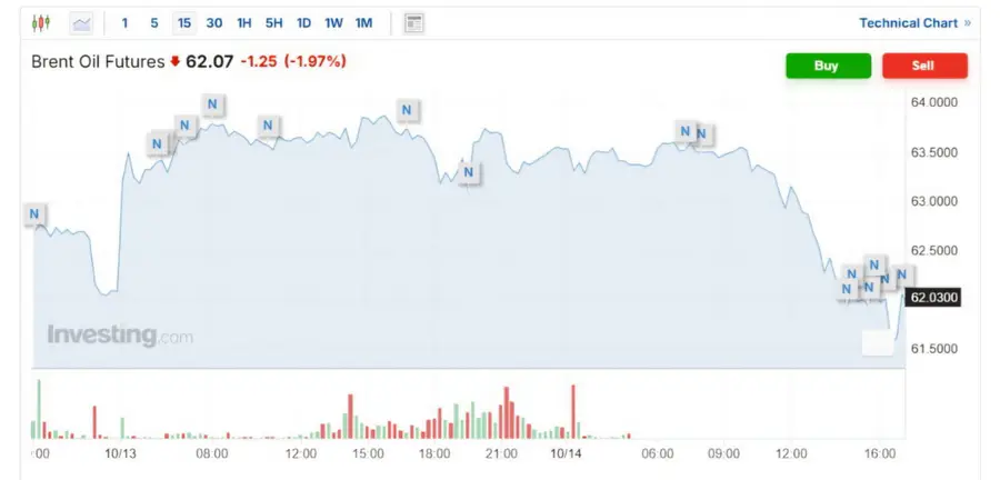 Цена декабрьских фьючерсов на нефть марки Brent упала на 1,97%, составив 62,07 доллара за баррель, в то время как стоимость ноябрьских фьючерсов на нефть марки WTI снизилась на 2,02%, достигнув 58,29 доллара за баррель.