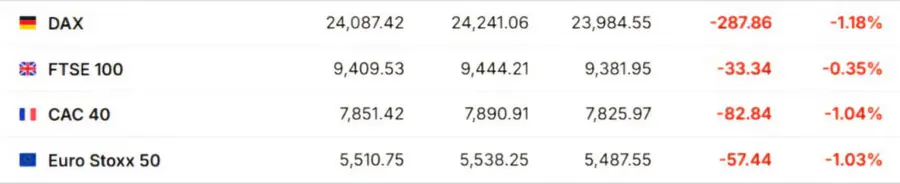 Европейские рынки также показали снижение из-за опасений инвесторов. Основные индексы, такие как FTSE 100 (-0,35%, Великобритания), Euro Stoxx 50 (-1,03%, еврозона), DAX (-1,18%, Германия) и CAC 40 (-1,04%, Франция), отметили падение.