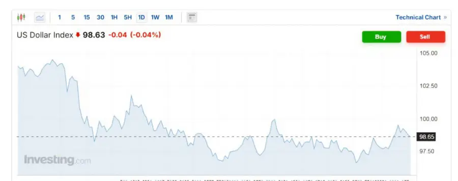 Индекс доллара США (DXY), отражающий курс доллара по отношению к корзине основных валют, снизился на 0,04%. Это ослабление происходит на фоне растущей напряженности в торговых отношениях между США и Китаем, что создает неопределенность для инвесторов.
