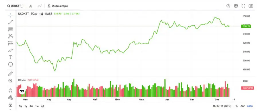 На Казахстанской фондовой бирже (KASE) курс доллара составил 537,84 тенге, что на 1,6 тенге меньше по сравнению с предыдущими торгами. Официальный курс Национального банка на 16 октября установлен на уровне 539,56 тенге за доллар.