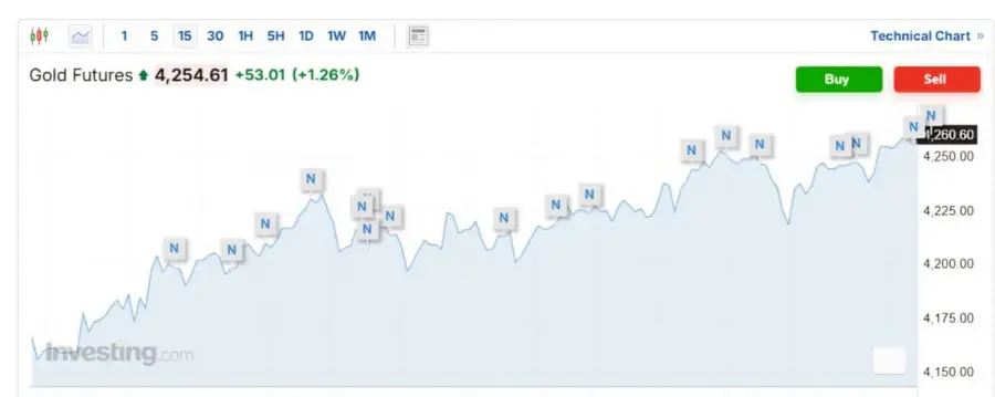 Цена на золото продолжает расти, достигнув уровня 4 254,61 доллара за унцию, что является следствием ожиданий снижения ставок ФРС и обострения геополитической ситуации. Увеличение интереса к золоту также связано с торговым конфликтом между США и Китаем, а также неопределенностью, связанной с приостановкой работы правительства США.