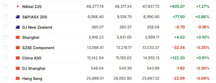 Азиатские фондовые рынки закрылись с разнонаправленной динамикой. В Китае индекс Shanghai Composite увеличился на 0,10%, тогда как Hang Seng снизился на 0,09%. В Японии индекс Nikkei 225 вырос на 1,27% благодаря росту акций технологических компаний и ожиданиям стимулирующих мер со стороны правительства.