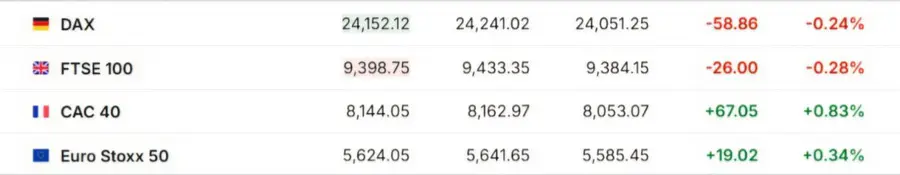 На европейских рынках также наблюдается разнонаправленная динамика. Индексы Euro Stoxx 50 и CAC 40 показали рост, в то время как FTSE 100 и DAX снизились.