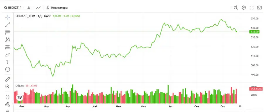 На Казахстанской фондовой бирже (KASE) средневзвешенный курс доллара на 15:30 по времени Астаны составил 536,32 тенге, что на 1,32 тенге ниже предыдущего значения. Официальный курс Национального банка на 17 октября установлен на уровне 537,84 тенге за доллар.