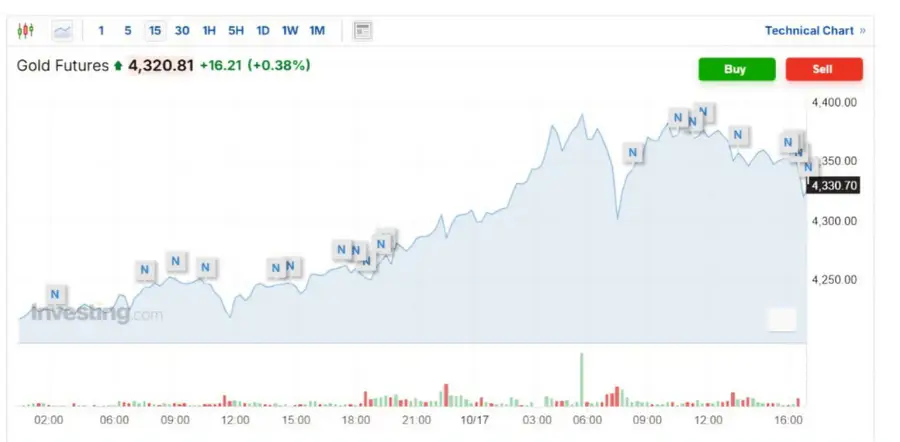 На фоне геополитической и экономической неопределенности, а также ожиданий снижения ставок ФРС, цены на золото вновь достигли рекордных уровней, превысив 4 300 долларов за унцию. Фьючерс на золото увеличился на 0,38 процента, достигнув 4 320,81 доллара за унцию, что свидетельствует о растущем спросе на безопасные активы.