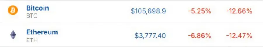 Курс биткоина (BTC) упал на 5,25 процента, а эфириума (ETH) - на 6,86 процента, составив 3 777,40 доллара за монету. Падение криптовалют связано с переходом инвесторов от рискованных активов к более стабильным в условиях глобальной экономической неопределенности.