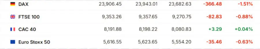 Европейские рынки продемонстрировали разнонаправленную динамику: индексы Euro Stoxx 50 (-0,63 процента), FTSE 100 (-0,88 процента) и DAX (-1,51 процента) снизились, в то время как индекс CAC 40 (+0,04 процента) показал небольшой рост.