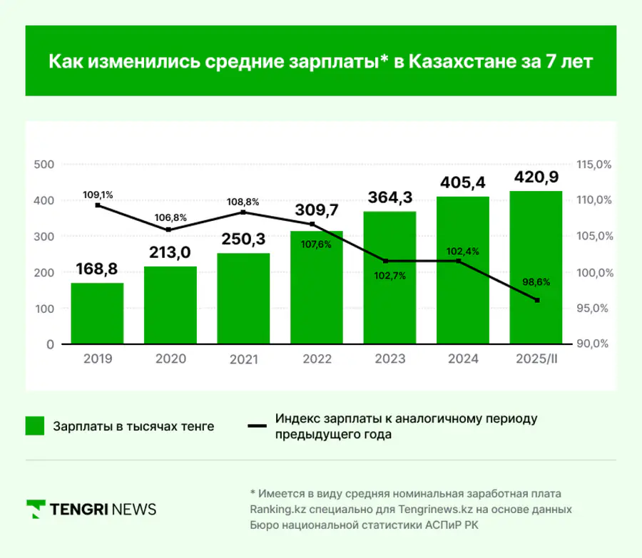 Средняя номинальная заработная плата в Казахстане за последний год увеличилась на 9,8% и достигла 420,9 тысячи тенге. Этот показатель рассчитывается как сумма общего фонда заработной платы, делённая на количество работников, и используется для сравнения зарплат в различных секторах экономики.