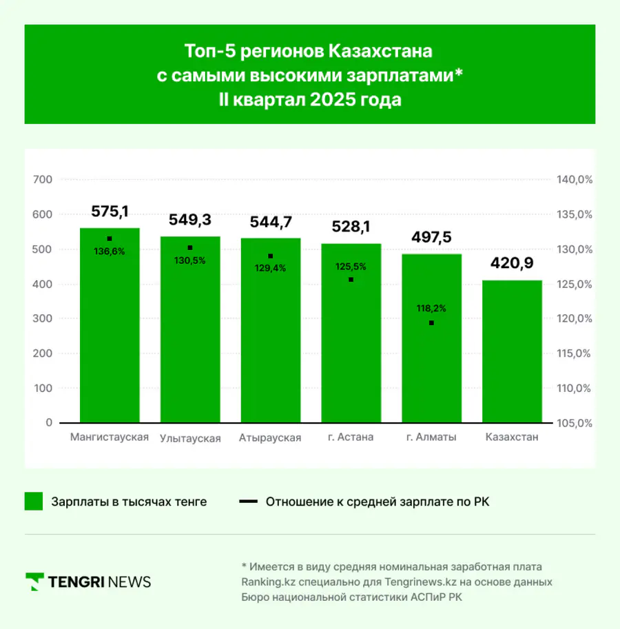 На основе данных Бюро национальной статистики Казахстана был составлен рейтинг регионов по средней заработной плате. В топ-5 вошли: