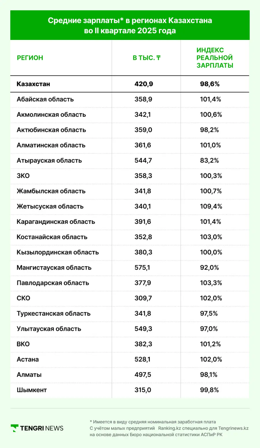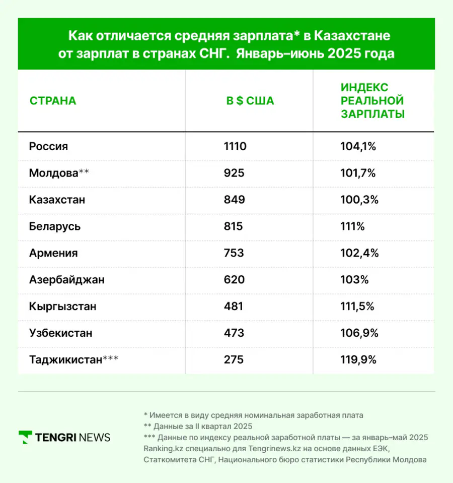 По сравнению с другими постсоветскими странами, Казахстан занимает третье место по средней заработной плате, составившей 849 долларов США за первую половину 2025 года. Лидерами являются Молдова (925 долларов) и Россия (1,1 тысячи долларов). Однако по индексу реальной зарплаты Казахстан оказался на последнем месте среди стран СНГ с показателем 100,3%, что свидетельствует о том, что покупательная способность фактически не увеличилась.