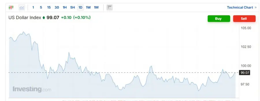Индекс доллара США (DXY) вырос на 0,10% благодаря возвращению инвесторов к американской валюте как к безопасному активу. Кроме того, слабая инфляция в Великобритании ослабила фунт, что также способствовало укреплению доллара.