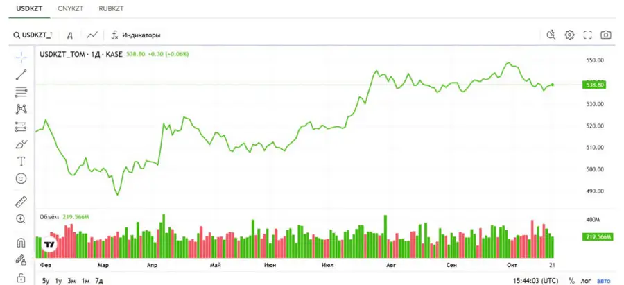 На Казахстанской фондовой бирже (KASE) средневзвешенный курс доллара составил 538,53 тенге, что на 0,08 тенге меньше по сравнению с предыдущими торгами. Официальный курс Национального банка на этот день составляет 538,56 тенге за доллар.