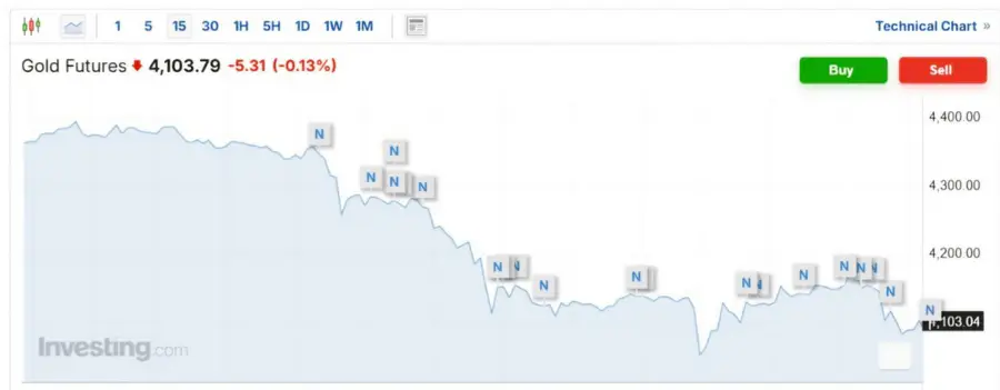 Цена на золото значительно снизилась, что связано с переходом инвесторов к другим активам на фоне укрепления доллара и роста доходности казначейских облигаций США. Фьючерс на золото упал на 0,13% и сейчас составляет 4 103,79 доллара за унцию.