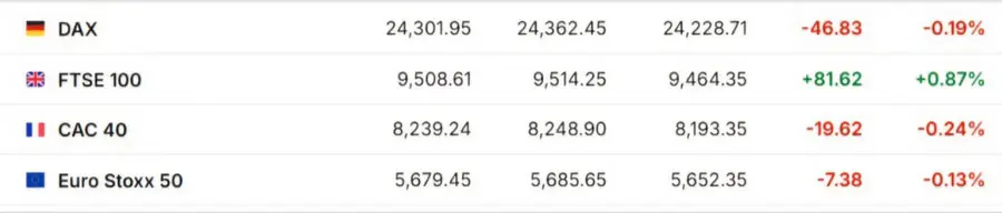 Европейские рынки показали смешанную динамику. Индексы DAX и CAC 40 снизились из-за слабых корпоративных отчетов, в то время как FTSE 100 вырос благодаря более мягким данным по инфляции в Великобритании. Из основных индексов Euro Stoxx 50 упал на 0,13%, DAX - на 0,19%, и CAC 40 - на 0,24%. FTSE 100, напротив, вырос на 0,87%.