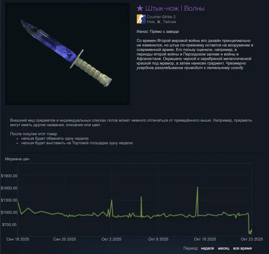 Обновление компьютерной игры Counter-Strike 2 (CS2), выпущенное 23 октября 2025 года, привело к катастрофическим последствиям на рынке виртуальных косметических предметов — скинов. Как сообщает Tengri Sport, стоимость всех скинов в игре упала с 6 миллиардов до приблизительно 4 миллиардов долларов, что составляет убыток в 2 миллиарда долларов за один день.