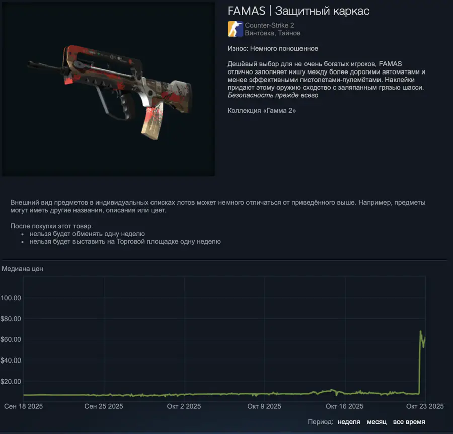 В то же время обычные скины, которые раньше стоили недорого, значительно подорожали. Например, раскраска для винтовки FAMAS — «Защитный каркас» — подскочила в цене с 8 до 60 долларов и выше. Некоторые игроки даже заработали на этом тысячи долларов.