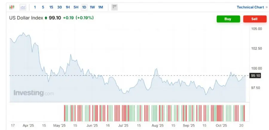 Индекс доллара США (DXY), который отражает курс доллара по отношению к основным мировым валютам, увеличился на 0,19 процента. Это связано с подорожанием нефти на фоне введения санкций США против российских нефтяных компаний, таких как "Роснефть" и "Лукойл", что усилило инфляционные ожидания и спрос на американскую валюту. Кроме того, слабость иены из-за политики Банка Японии и рост доходности казначейских облигаций США также способствовали укреплению доллара.