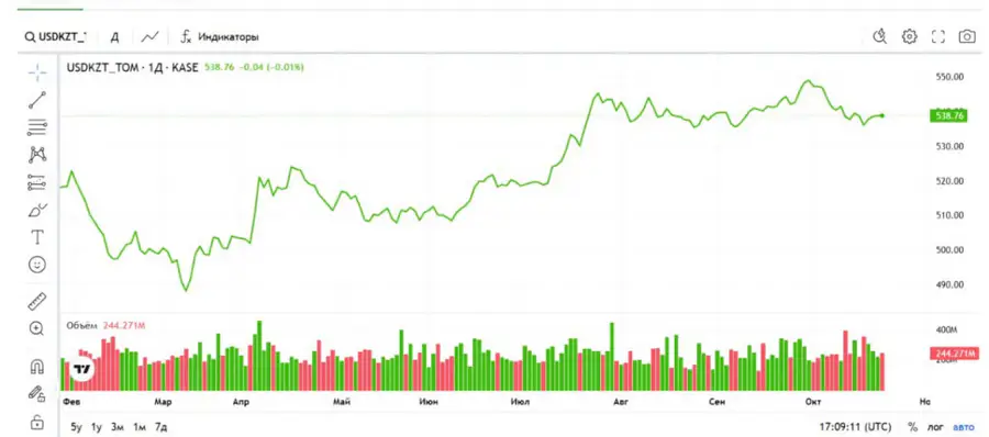 На Казахстанской фондовой бирже (KASE) средневзвешенный курс доллара на 17:00 по времени Астаны составил 538,11 тенге, что на 0,45 тенге ниже предыдущего значения. Официальный курс Национального банка на 23 октября составляет 538,56 тенге за доллар.