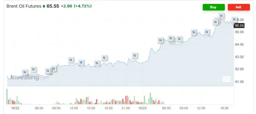 Цены на нефть возросли из-за новых санкций США против российских нефтяных компаний, что вызвало опасения по поводу сокращения поставок на мировой рынок. Также были опубликованы данные о снижении запасов нефти в США. Цена декабрьских фьючерсов на нефть марки Brent выросла на 4,73 процента, достигнув 65,55 доллара за баррель, в то время как ноябрьские фьючерсы на нефть WTI увеличились на 5,11 процента до 61,49 доллара за баррель.