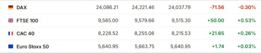 Европейские рынки показали смешанную динамику: Euro Stoxx 50 (+0,03 процента), CAC 40 (+0,26 процента), FTSE 100 (+0,53 процента) - все выросли, тогда как DAX снизился на 0,30 процента.