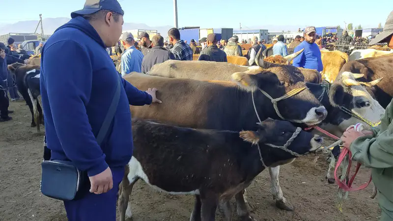 На торговой площадке мы встретили бычков и коров. Средняя цена на бычков в возрасте 5-6 месяцев составляет около 500 тысяч тенге. Продавцы уточняют, что именно эту сумму они просят за животных.