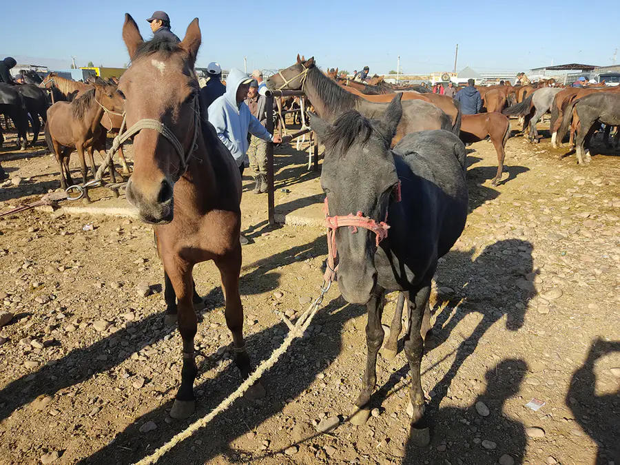 Перемещаясь к секции с лошадьми, мы увидели, что для них предусмотрены специальные стойки. Продавцы держат своих лошадей за повод.