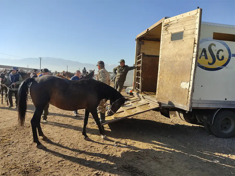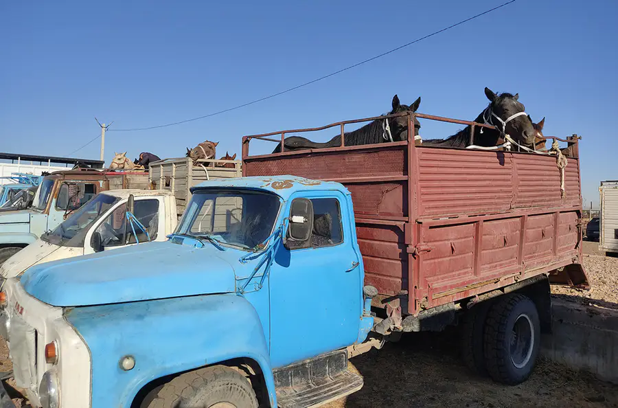 Животных привозят в различных транспортных средствах: овцы часто находятся в низких полупрозрачных прицепах, а лошади — в кузовах грузовиков или закрытых фургонах.