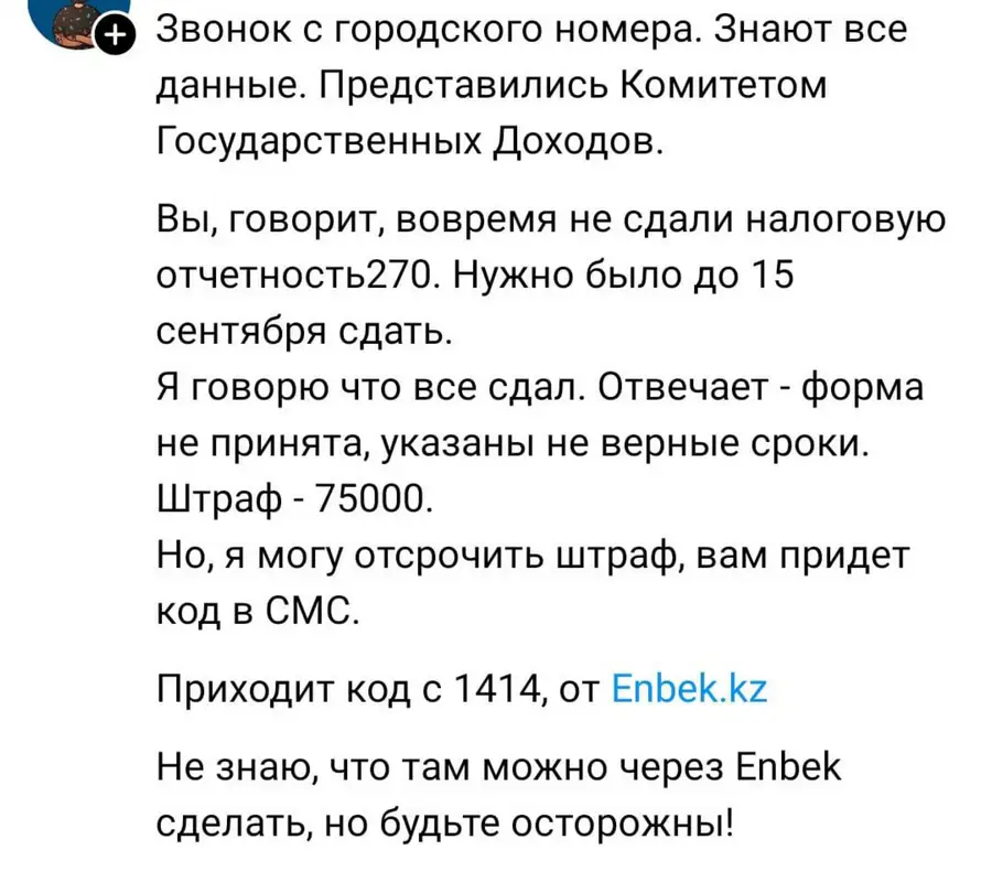 Полиция Казахстана выпустила предупреждение о новом виде мошенничества, связанном с налоговыми декларациями. Злоумышленники представляются сотрудниками государственных органов и утверждают, что гражданин якобы пропустил срок подачи налоговой декларации.
