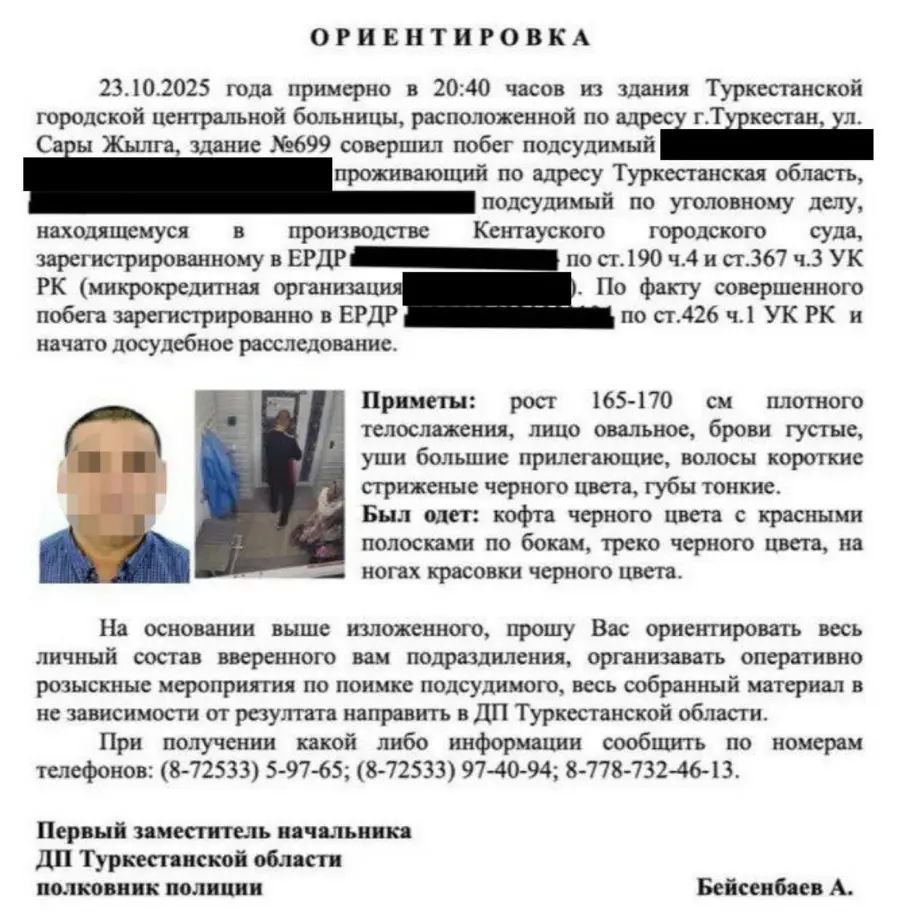 В Туркестанской области разыскивают мужчину, сбежавшего из больницы. Он проходит по делу о мошенничестве и взятке, связанном с микрокредитной организацией. Полиция объявила розыск, выставлены посты, а также проводится служебное расследование.