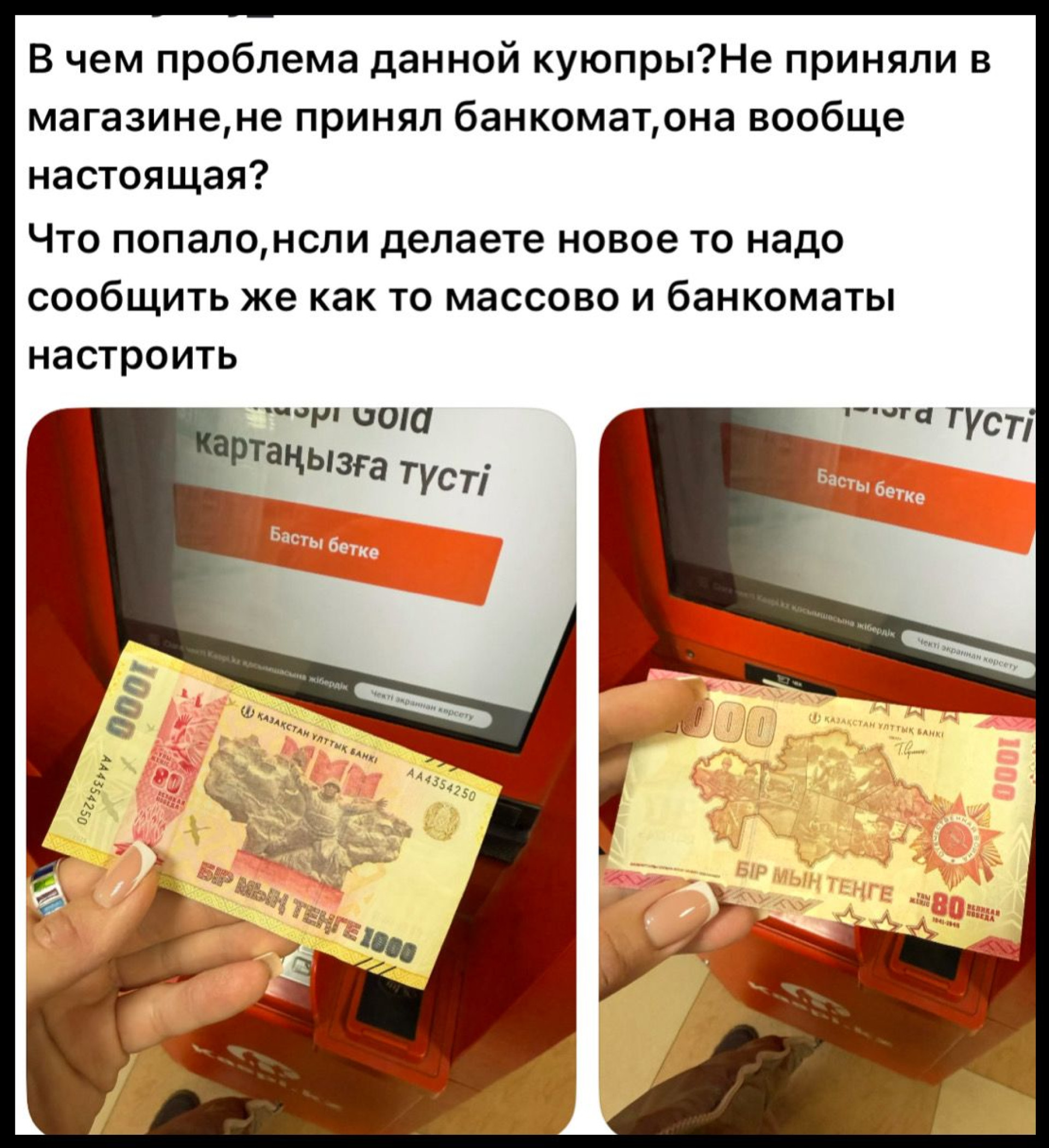 В Казахстане возникли проблемы с новой юбилейной купюрой номиналом 1000 тенге, выпущенной в честь Дня Победы в Великой Отечественной войне. Одна из гражданок столкнулась с тем, что ее купюру не приняли ни в магазине, ни в банкомате.